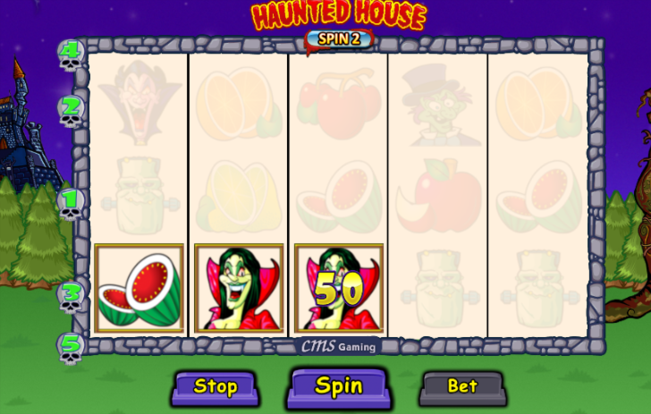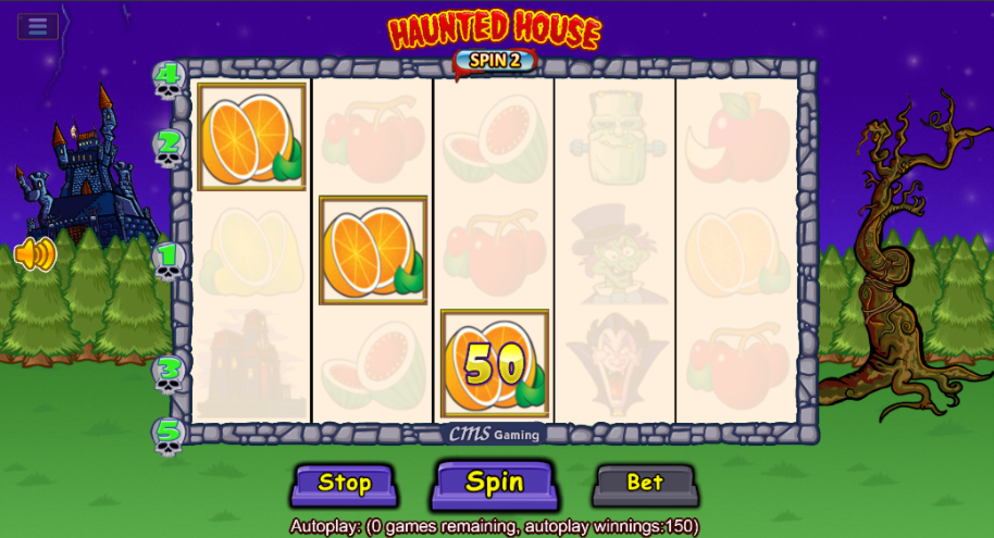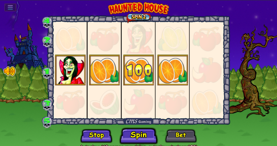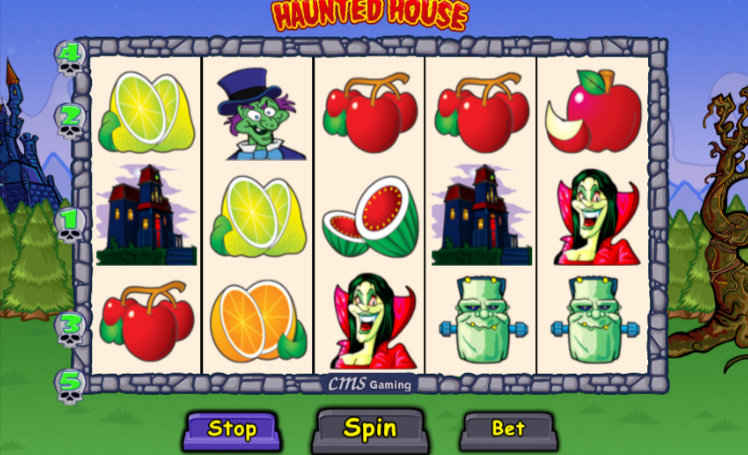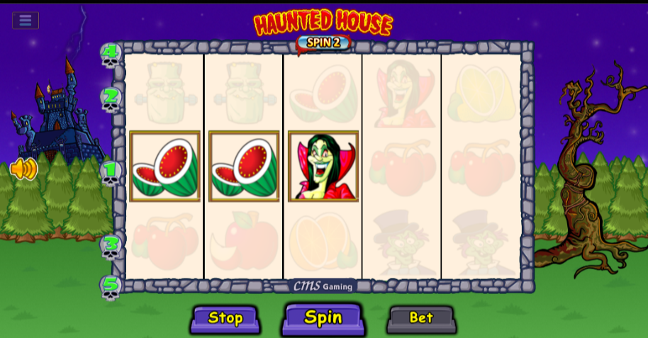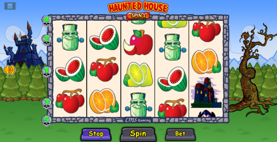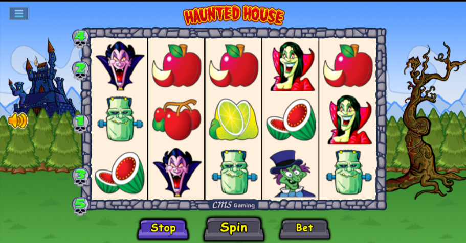 Haunted House sfoggia un’ambientazione horror caricaturale, più divertente che spaventosa. I rulli sono incorniciati nella facciata di un vecchio castello stregato, sullo sfondo di una foresta brulla al crepuscolo. I simboli del gioco mischiano classici elementi horror e icone da fruit machine: incontrerai un vampiro dallo sguardo ironico, una vampiressa (la “strega” Wild) dal sorriso beffardo, un Frankenstein verde pastello e un piccolo fantasma dispettoso. Accanto a loro compaiono anche frutti tipici delle slot da bar – ciliegie, limoni, arance, mele e angurie – come a sottolineare il legame di Haunted House con le slot machine tradizionali da sala.